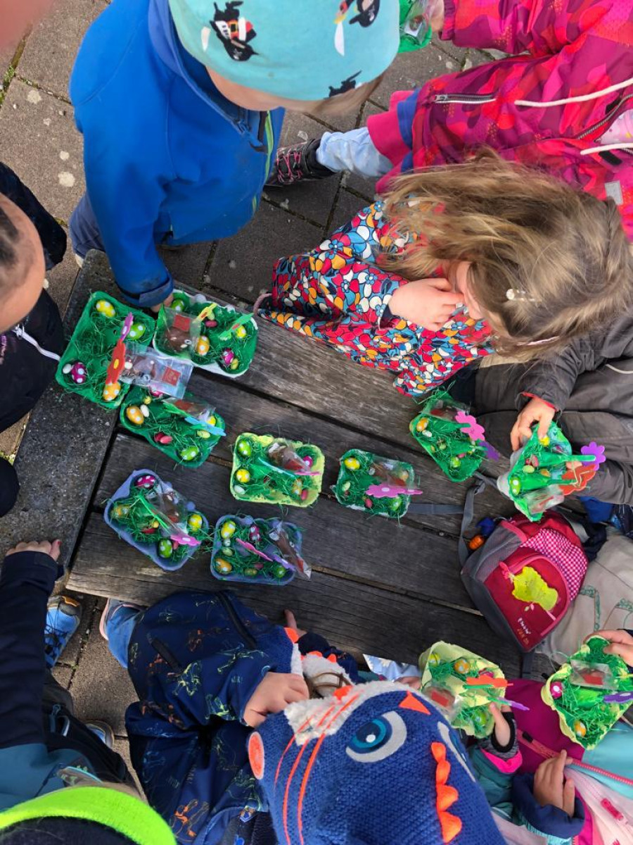 Juhui! Der Osterhase kam auch bei uns vorbei und hat den Spielgruppenkindern draussen im Grünen Osternestli versteckt. Nachdem alle ihre Nestli gefunden hatten blieb noch Zeit zum Spielen.